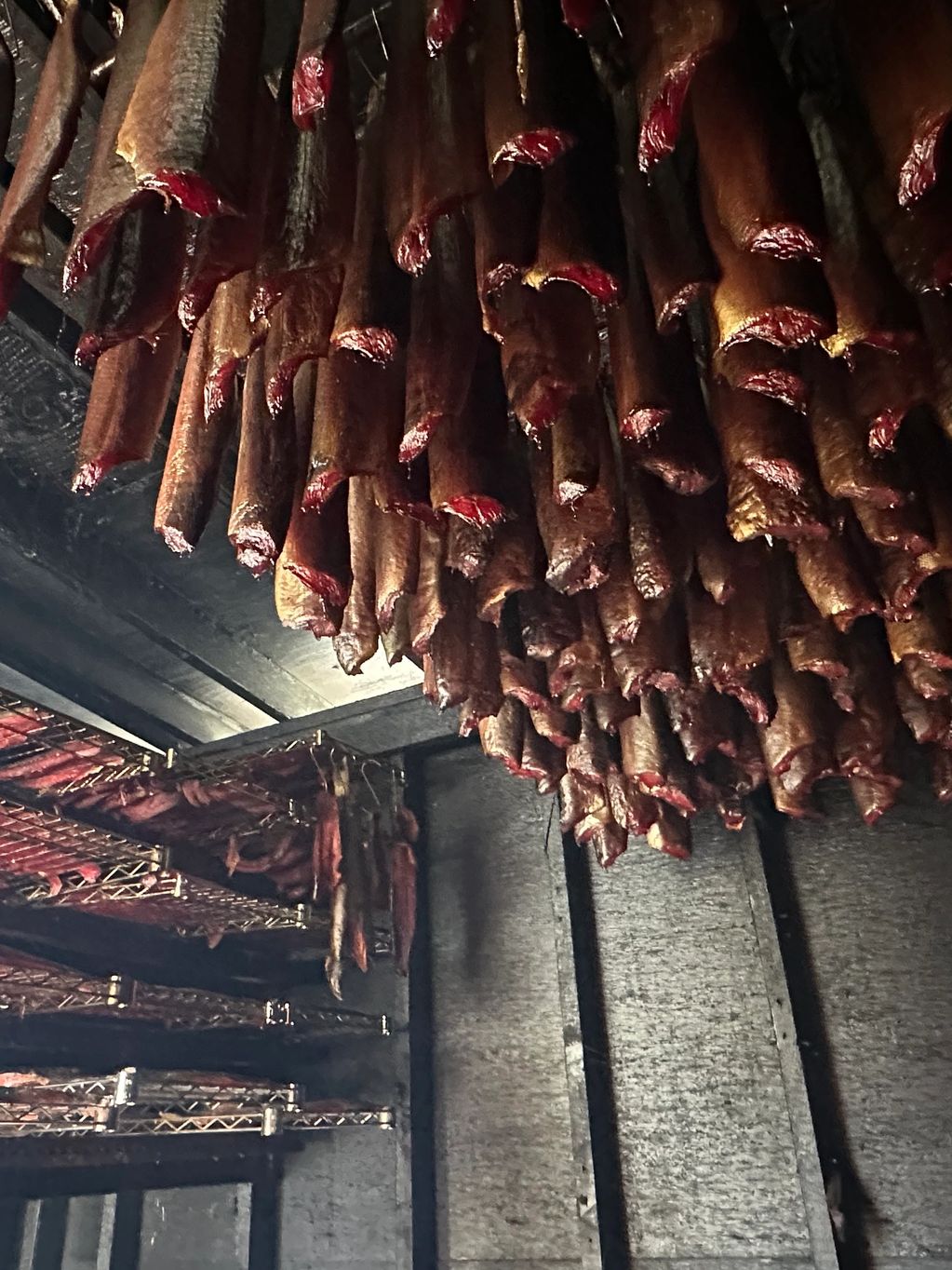 Some get taken down for lite-smoked and canned. The rest stays in the smokehouse for up to 13 days.
