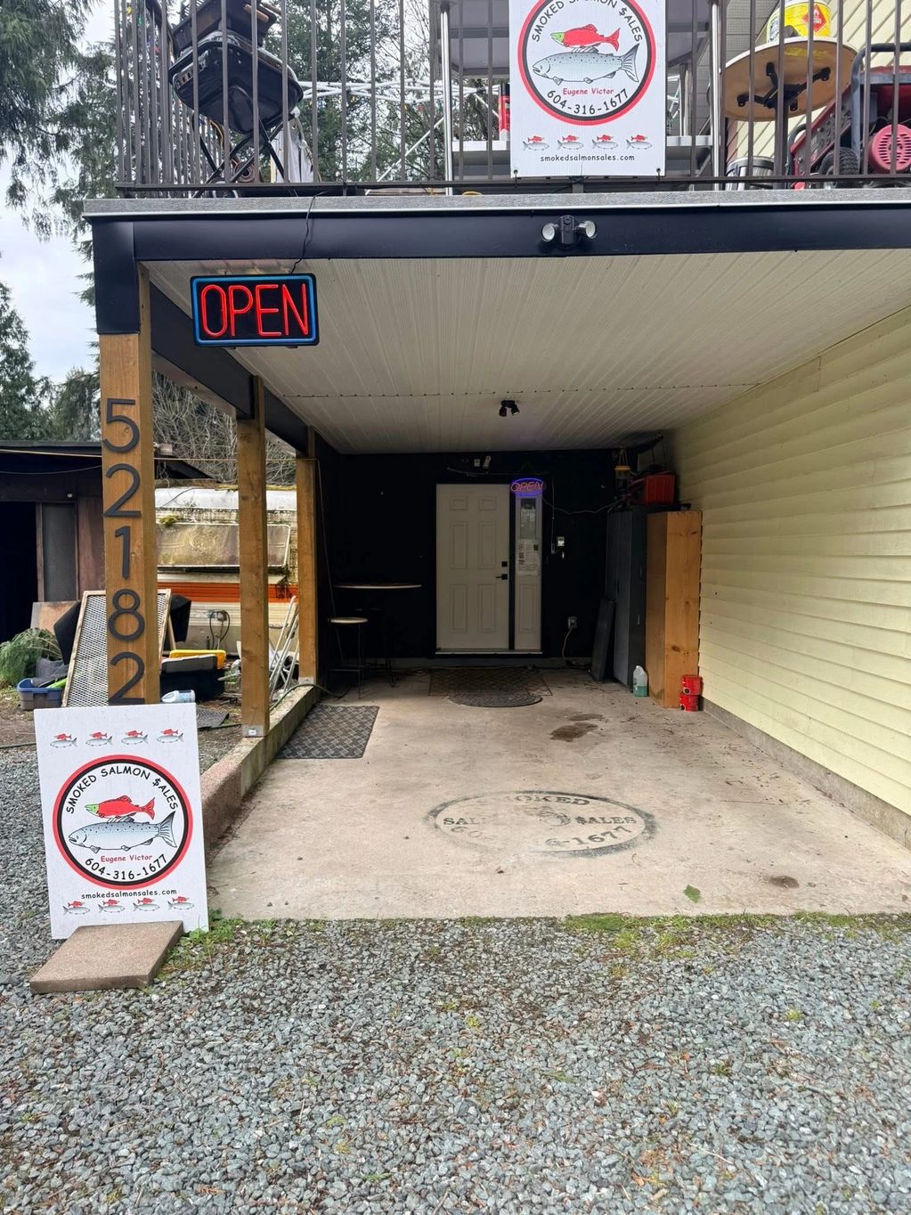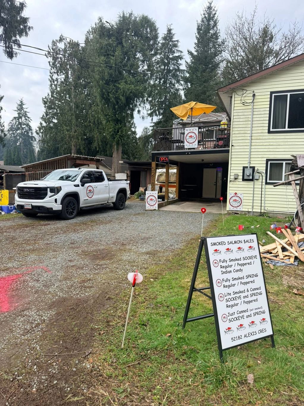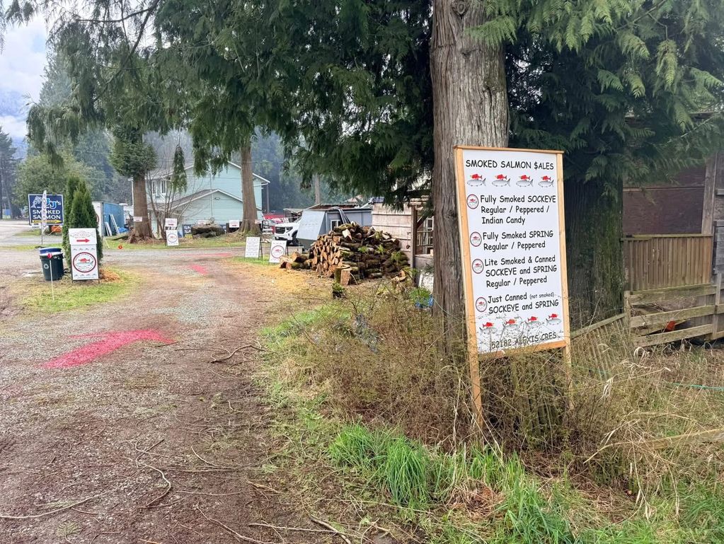 Smoked Salmon $ales is the yellow house, first one on the right. White signs guide you into the driveway.